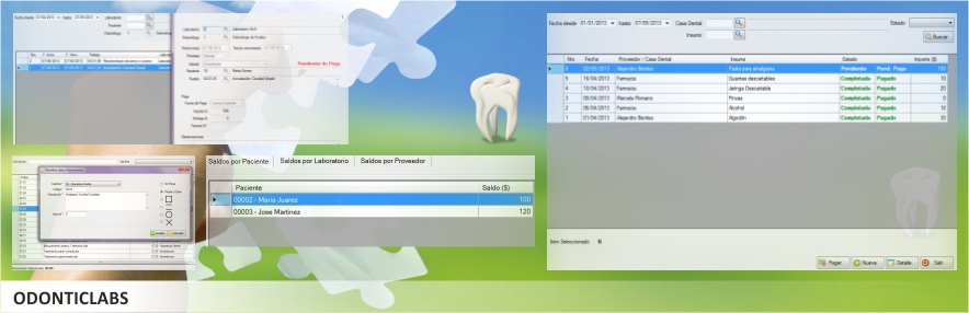 Proveedores y otro tipo de Contactos, Presupuestos, Compras, Movimientos de dinero diario general y por odontólogo, reportes con gráficos, entre otros.