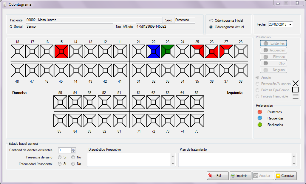 Desde la misma pantalla de Pacientes se puede consultar datos filiatorios, Odontograma inicial y actual,